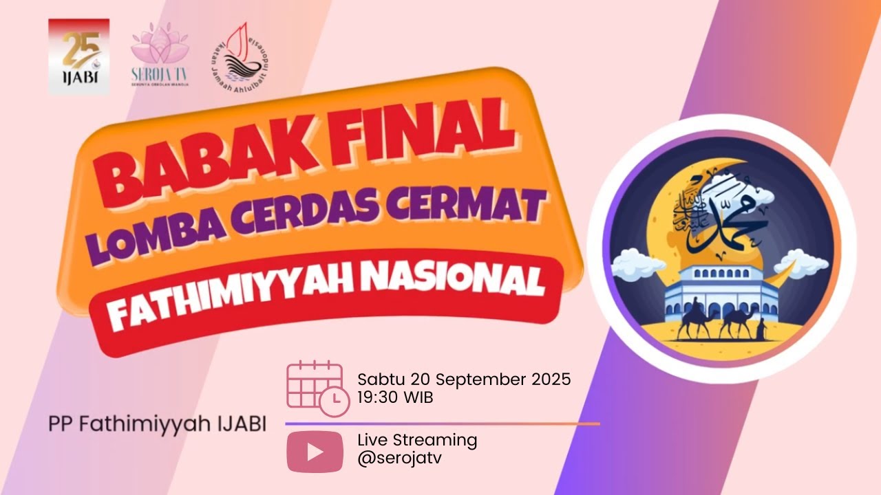 Babak final lomba cerdas cermat buku Allah Yarham K.H. Jalaluddin Rakhmat, selanjutnya dilaksanakan pada hari Sabtu, 20 september 2025 pukul 19.30 WIB. Untuk menambah kemeriahan acara, kami turut mengundang dua juri cerdas cermat Ibu Dewi Utama dan Ibu Anna Farida. Acara tersebut diadakan secara live streaming dari channel youtube Seroja TV yang dapat disaksikan kembali pada link ini.